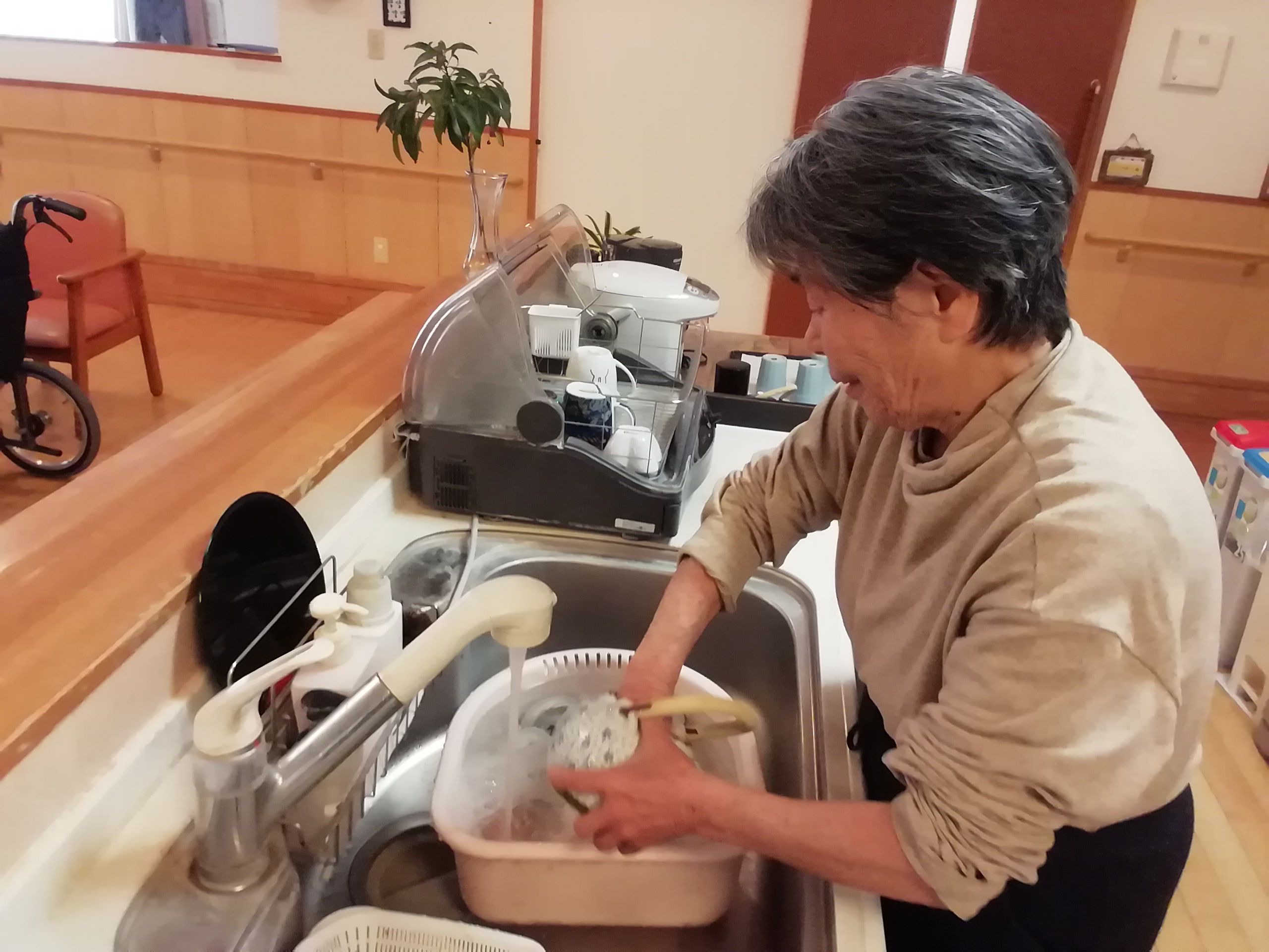 昼食後、ご利用者より「何かすることないですか?」と尋ねてこられました。ちょうど湯吞み等をハイターにつけており、それを洗い流し乾燥機に入れる作業があり、お手伝いしていただきました。ご利用者は腕まくりをして、きれいに洗っていただきました。
