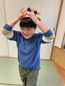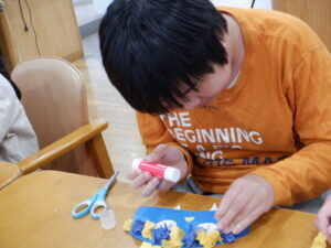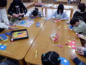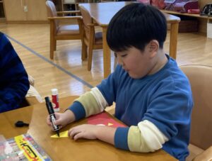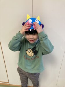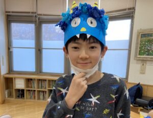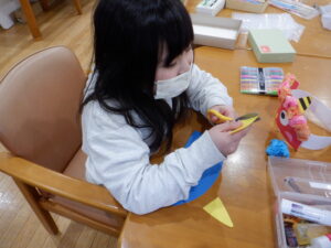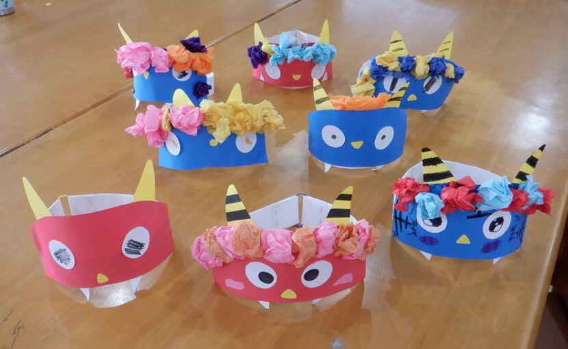 花紙で鬼の髪の毛を作ったり、自由に顔を描いたりと楽しみながら取り組んでいた子どもたちです♪